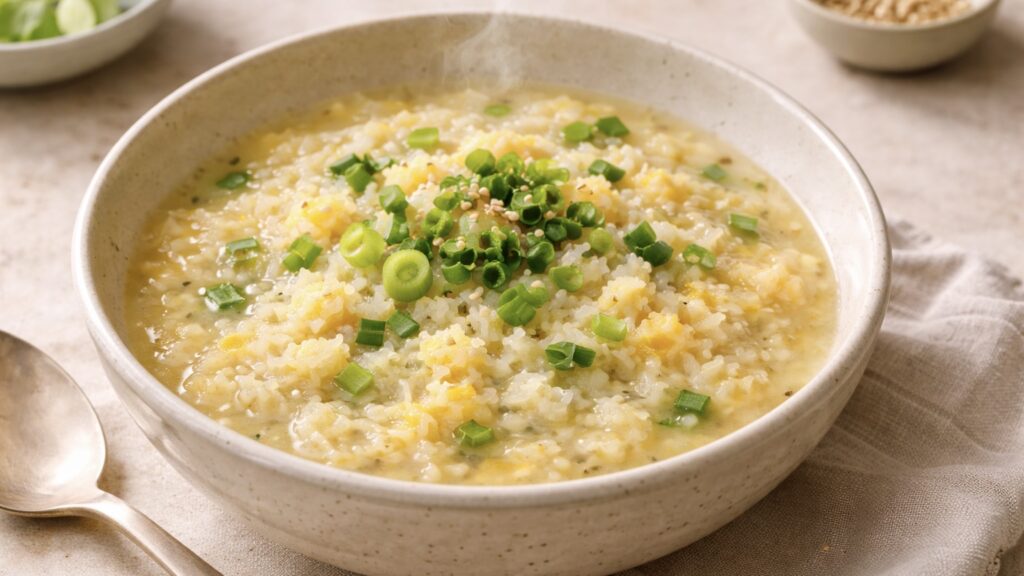 ご飯、卵、ネギを加えれば、優しい味の雑炊に。胃腸が疲れている時にもおすすめ。