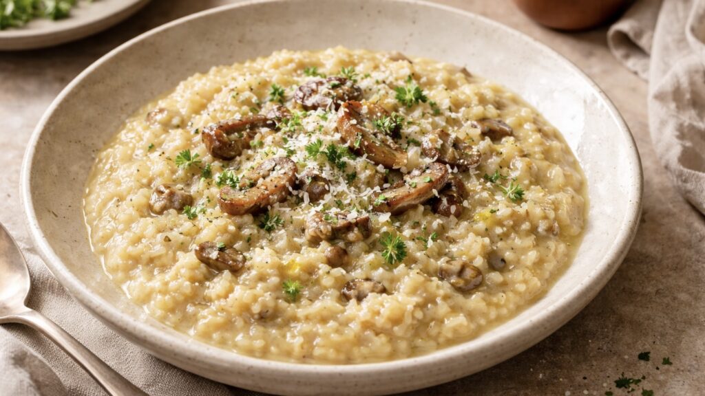 ボーンブロスでお米を炊けば、栄養たっぷりのリゾットに。