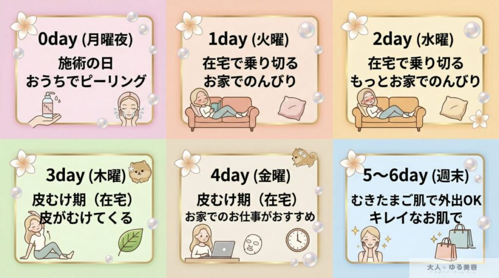 | 4〜5日目 | 皮むけ本番〜完了 | △ 目立つ | 薄めならOK | 通常勤務可 |
