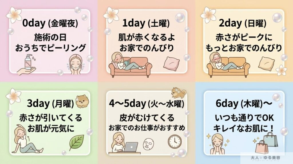 | 6日目 | 皮むけ後 | ○ | 通常OK | 通常勤務可 |