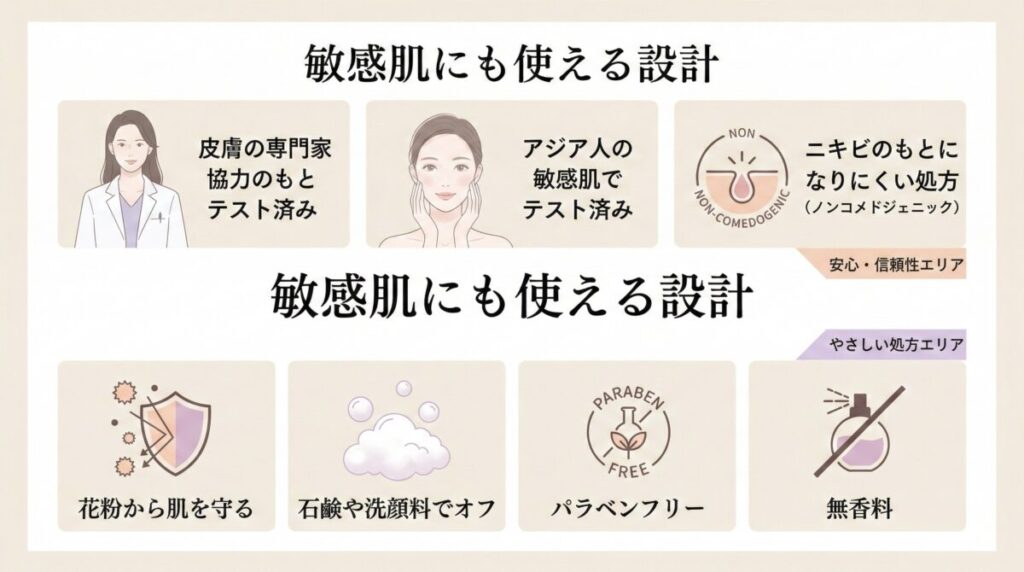 皮膚科医の協力のもとテストされており「肌に負担をかけずに、トーンアップ効果で明るい印象に整えたい」という願いを持つ方や、もちろん敏感肌の方たちからも大人気。