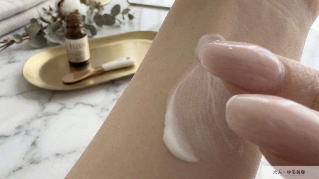 • ミルク状だけどとろっとした質感。指でのばすとすっと肌になじみ、べたつきが残らない
